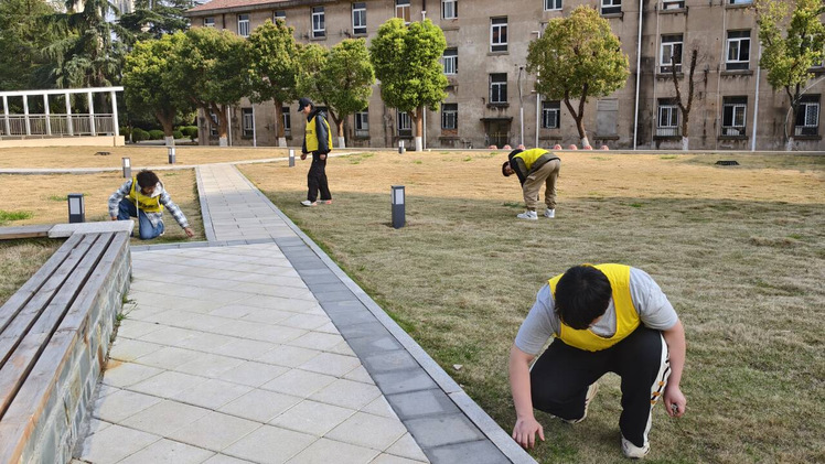 3月27日下午,志愿服务活动正式启动。志愿者们分工协作、迅速投入劳动,化身校园“美容师”与文明宣传员。大家手持清洁工具,细致清理绿化带深处纸屑、塑料垃圾与步道缝隙杂物;俯身扶正倒伏绿植、清除杂草杂枝,用心为春日校园绿化精心修整养护;同时主动向过往师生宣传环保理念,倡导爱护环境、文明同行,让文明风尚浸润校园角落。