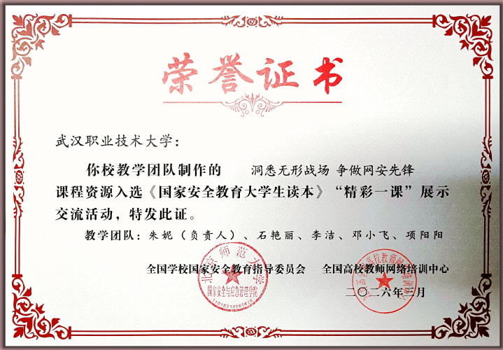 新闻网讯(通讯员 石艳丽)近日,教育部办公厅主办的《国家安全教育大学生读本》“精彩一课”展示交流活动评选结果公布。武汉职业技术大学马克思主义学院报送的《洞悉无形战场 争做网安先锋》课程资源成功入选,目前已在全国高校教师网络培训中心、中国大学生在线等国家级教育教学平台上线展播。