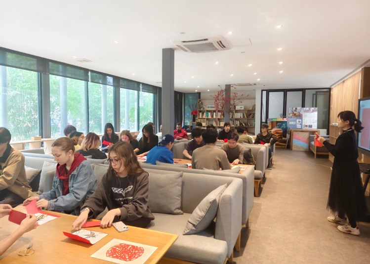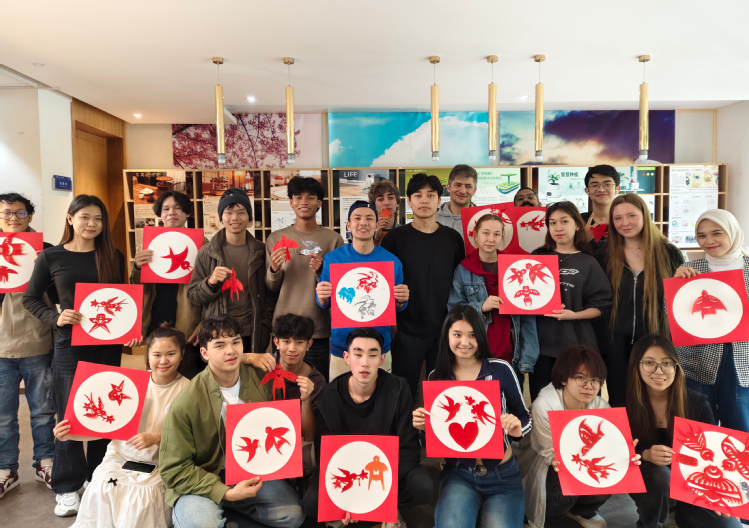 剪纸是中国极具代表性的民间艺术,方寸之间尽显巧思和变化。熊老师手持红纸,一步步现场演示折叠、描图、剪形、刻纹的完整技法。留学生们凝神观看、踊跃实践,翻飞的红纸碎屑中,一只只灵动春燕跃然纸上。