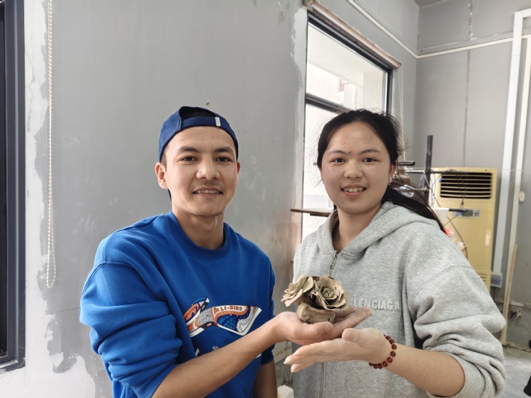 武职学子主动化身“助教”,与留学生并肩协作。乌兹别克斯坦留学生凯文完成一只别致花篮,兴奋地捧起作品展示,收获满场赞许。