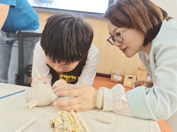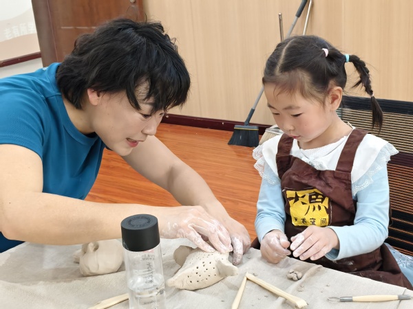 课堂上,主讲教师成锟贴合少儿认知特点,把专业陶艺技法拆解成简单有趣的步骤。从小鱼的外形特点、线条韵律,到陶泥的揉、捏、接、塑,成老师一步步耐心示范,细致解答孩子们的每一个疑问。