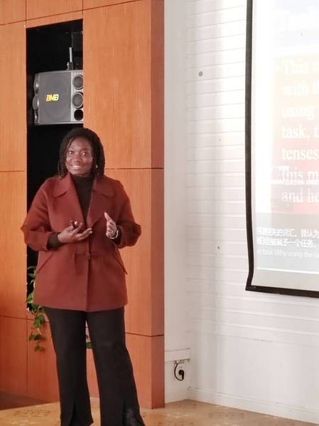 武职网讯(通讯员 李萌 大学生记者 陈方晗) 12月9号,由对外合作与交流处举办的第五期“专业教师英语轮训”系列活动在逸云楼咖啡厅和腾讯会议平台同步举行。喀麦隆籍教师EstherMezekeyTchoula以“浅谈英语教学理论”为主题展开本次培训,40余名教师线上线下参与轮训,与主讲人进行了互动交流。Esther分...
